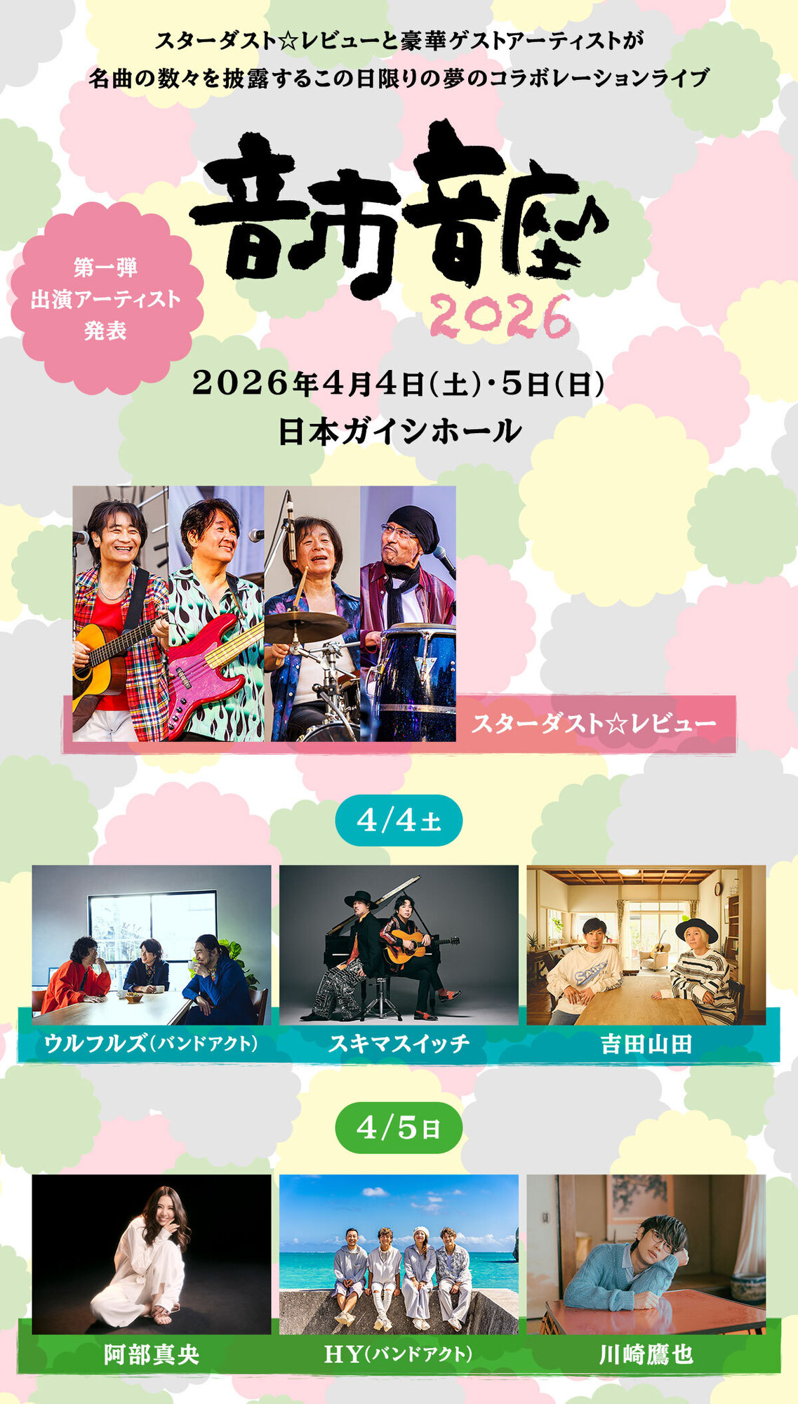4/5(日):スターダスト☆レビュー / 阿部真央 / HY (バンドアクト) / 川崎鷹也